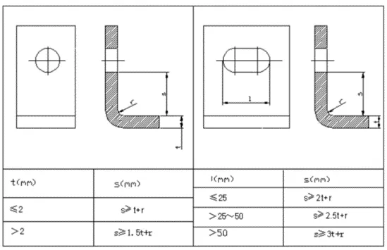 When the processing step involves punching before bending, the hole should be positioned outside the bending deformation zone to prevent deformation during bending. See the table below for the distance from the hole wall to the bending edge.