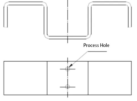 To ensure accurate positioning of the bending blank material in the mold and prevent scrap due to material misalignment during bending, process positioning holes are typically added in the design. This is especially important for parts that undergo multiple bending processes; the process holes must be used as the positioning reference to reduce cumulative errors and ensure product quality, as shown in the figure below.