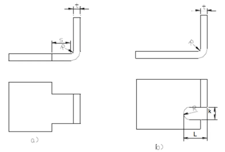 When bending a section of an edge locally, to prevent stress concentration at sharp corners and subsequent cracking, the bending line can be moved a certain distance to avoid abrupt dimensional changes (Figure a); or a process groove can be used (Figure b). Dimensional requirements: SโฅR; groove width kโฅt; groove depth Lโฅt+R+k/2.