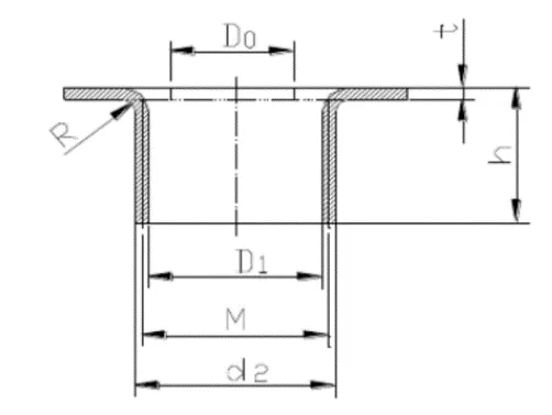 As shown in the figure above, the fillet radius between the flange and the wall of the stretched part should be greater than twice the material thickness t, i.e., r2 โฅ 2t. At the same time, in order to make the stretching process smoother, r2 is generally taken as (5~10)t, and the maximum flange radius should be less than or equal to 8 times the material thickness, i.e., r2 โค 8t.