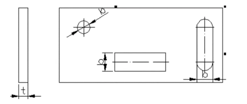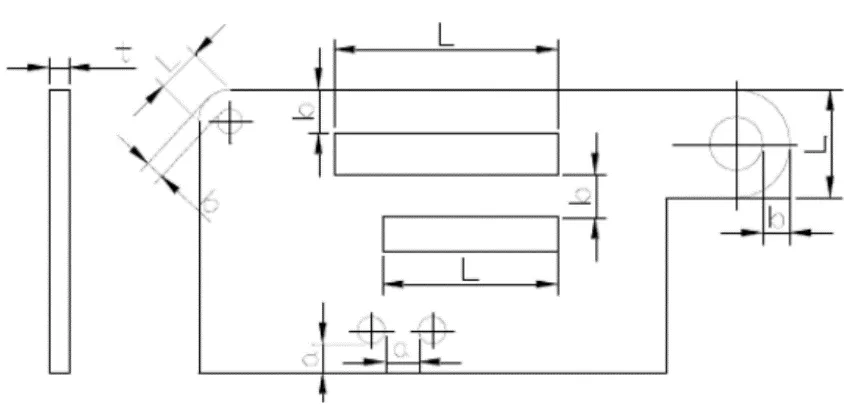 The minimum distance from the punched edge of a part to the edge of the part material is related to the shape of the part and the hole, as shown in the figure below. Specifically, when the punched edge is not parallel to the edge of the part’s outer shape, the minimum distance ‘a’ should be greater than the material thickness ‘t’; while when the punched edge is parallel to the edge of the part’s outer shape, the minimum distance ‘b’ should be greater than 1.5t.