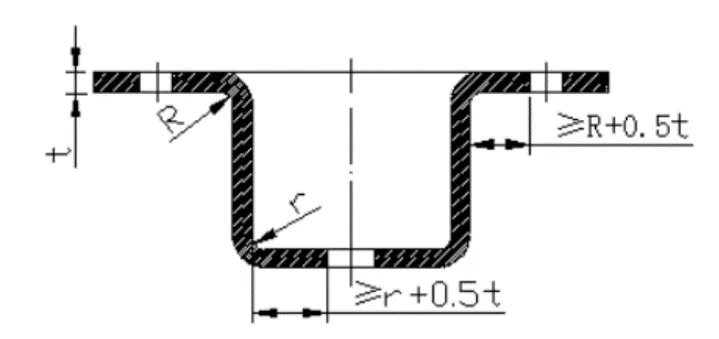 When punching holes in bent or drawn parts, the distance between the hole wall and the straight wall of the part is related to the inner radius of the fillet and the material thickness, as shown in the figure below.