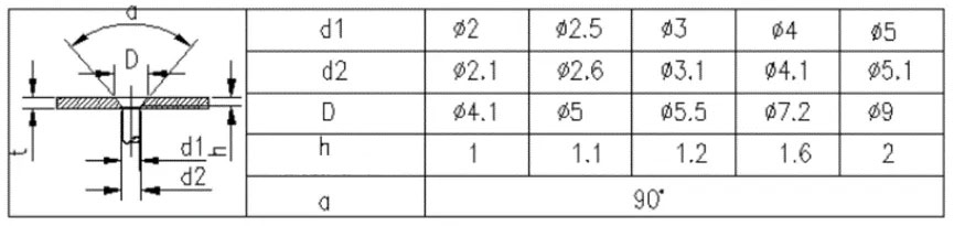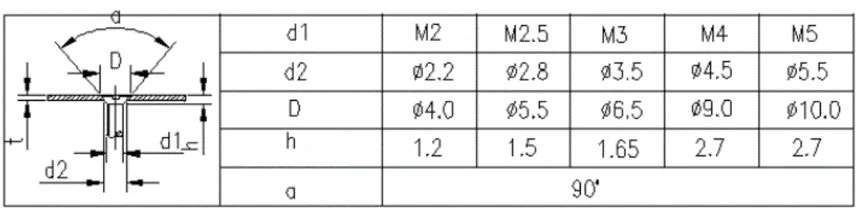 The structural dimensions of through holes and countersunk holes for screws, bolts, and rivets are usually selected according to the corresponding tables. For countersunk holes of countersunk screws and countersunk rivets, if it is difficult to simultaneously guarantee the through hole size d2 and the countersunk hole size D due to the insufficient thickness of the sheet metal material, the through hole size d2 should be guaranteed first.