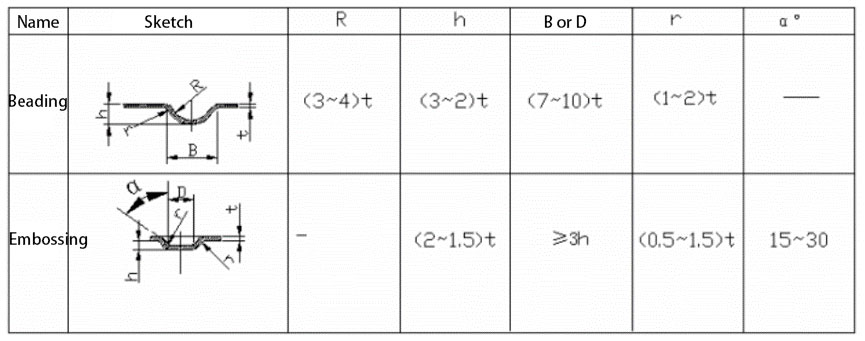 Adding ribs to plate-shaped metal parts helps increase structural rigidity. Common rib structures and their dimensional relationships are shown in the table below.