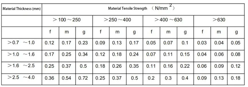 After sheet metal is stamped, burrs are formed on one side of the flat surface. To ensure the surface quality of the parts and prevent unnecessary injuries or damage, there are usually restrictions on the height of the burrs on the stamped parts, as shown in the table below. Grade f (precision grade) is suitable for parts with high requirements; grade m (medium grade) is suitable for parts with medium requirements; and grade g (rough grade) is suitable for parts with low requirements. In part design drawings, deburring is typically required for the outer surface of the parts, cable through-holes, and edges that are easily touched by hands.